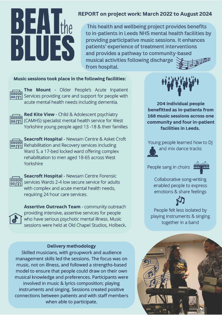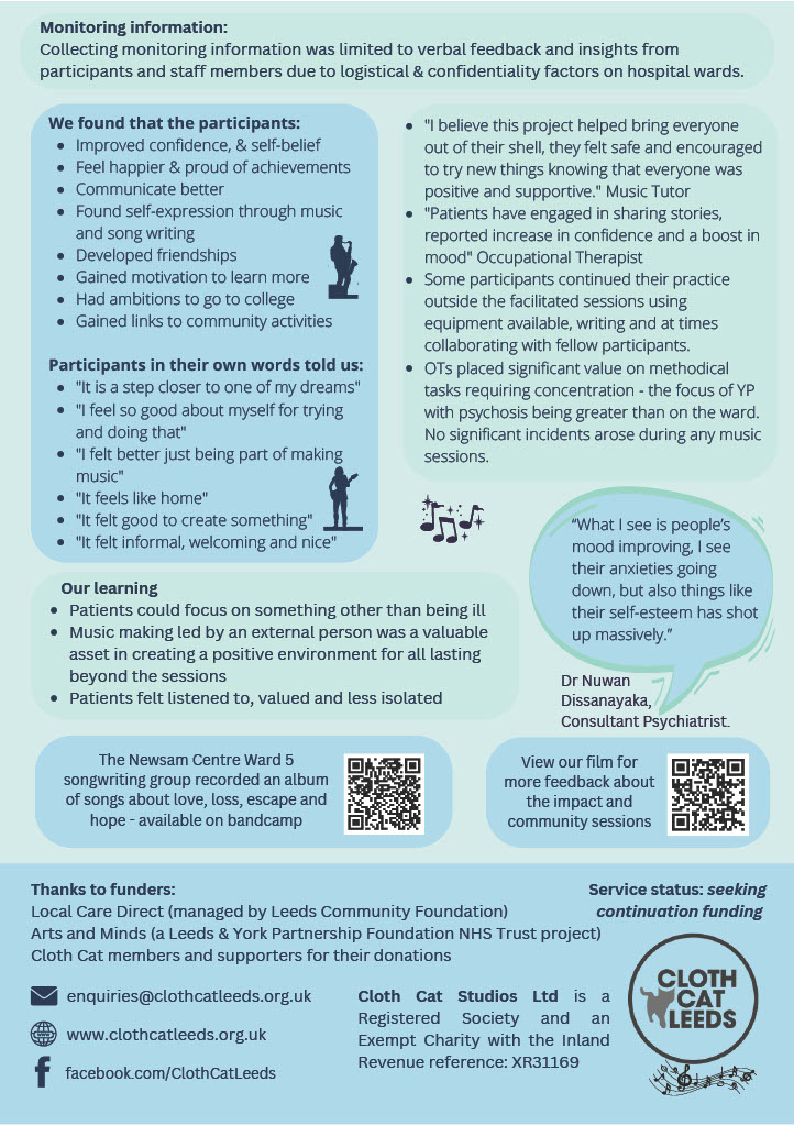 Feedback is that the wards were calmer and relationships between staff and patients improved in the days following a music session. Cloth Cat delivers these sessions as funding allows.